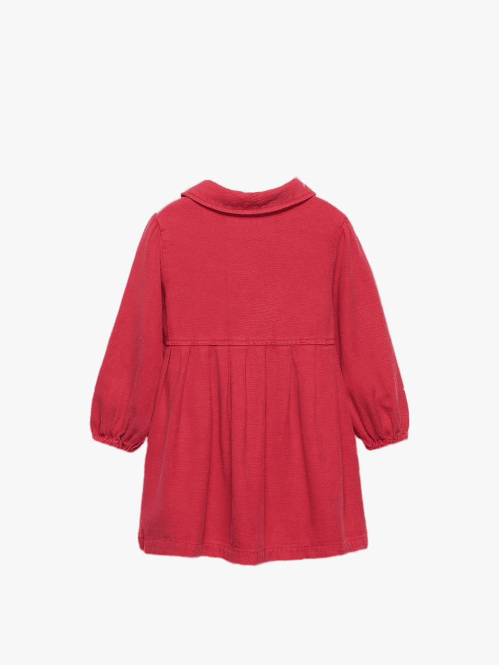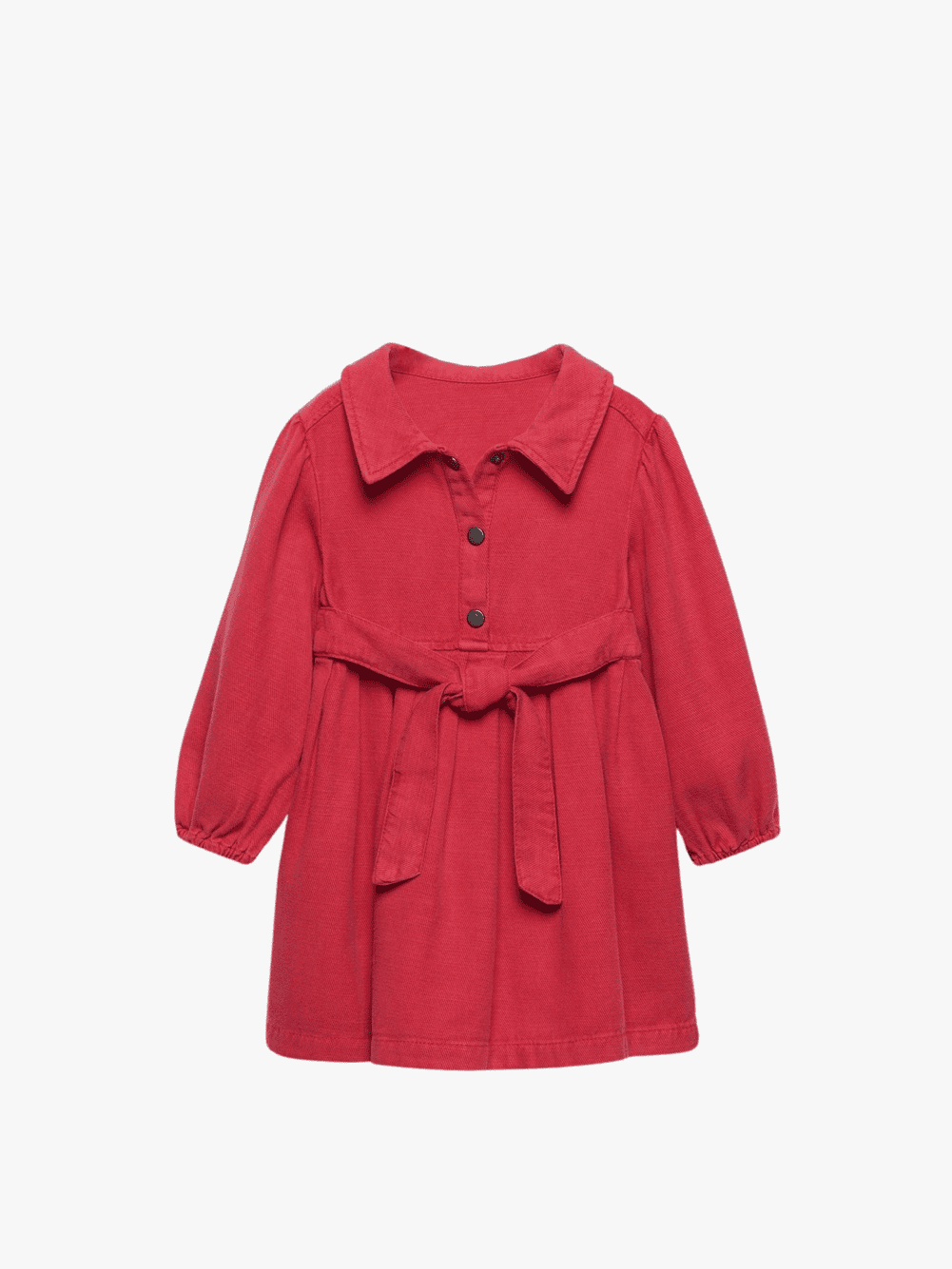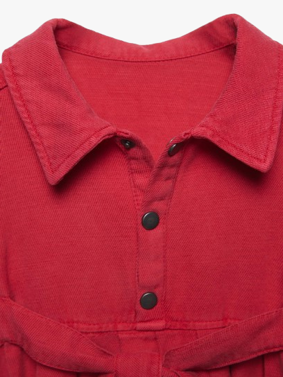 Dress with a shirt collar and long sleeves with elasticated cuffs. Button-up fastening on the yoke. Featuring a belt appliqué on the front.